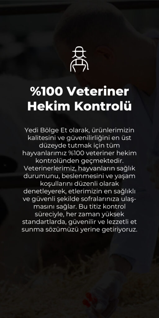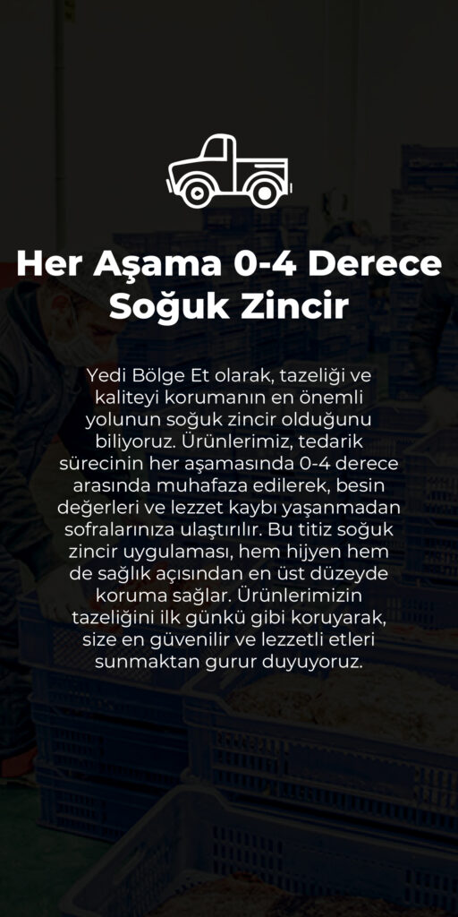 Müşterilerimizin sağlığı ve güvenliği bizim için her şeyden önemli. Yedi Bölge Et, hijyen ve güvenlik standartlarına tam uyum sağlayarak, tazeliği ve sağlıklı ürünleri garanti eder.