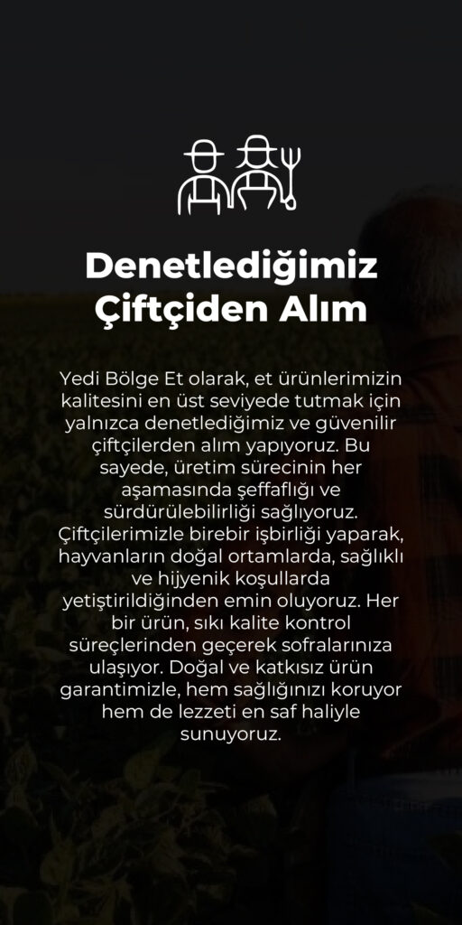 Yedi Bölge Et olarak, Türkiye’nin zengin hayvancılık kültürünü yansıtan, her bölgenin kendine özgü lezzetlerini sofralarınıza getiriyoruz. Kasaplık mesleğine duyduğumuz tutku ve uzmanlığımızla, müşterilerimize en kaliteli ve taze et ürünlerini sunma hedefindeyiz. Ürünlerimiz, doğallığı ve besin değerini koruyacak şekilde özenle seçilmekte ve işlenmektedir.